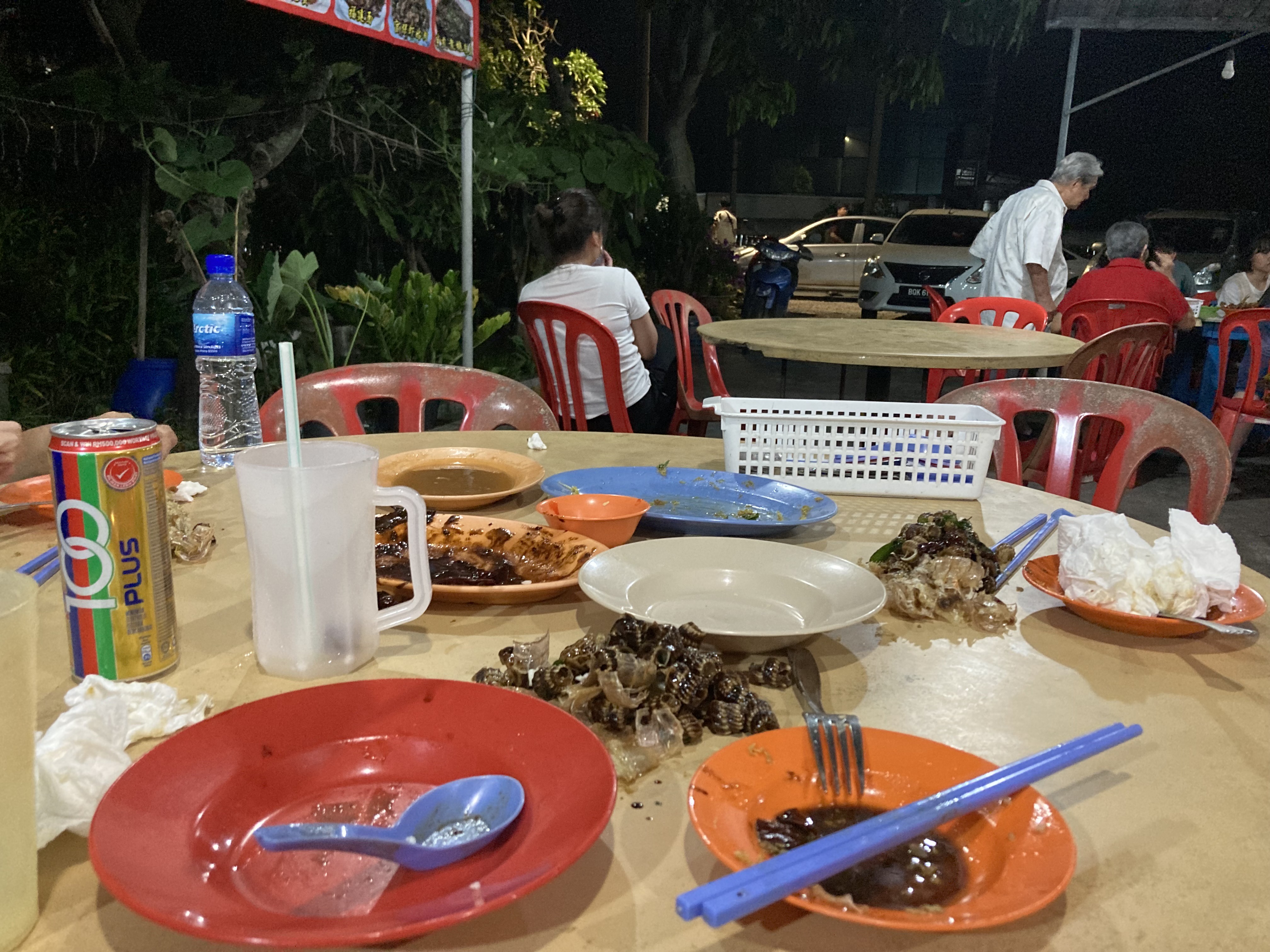 終わったテーブルでおばちゃんがテーブルの上の殻たちをはいてました。